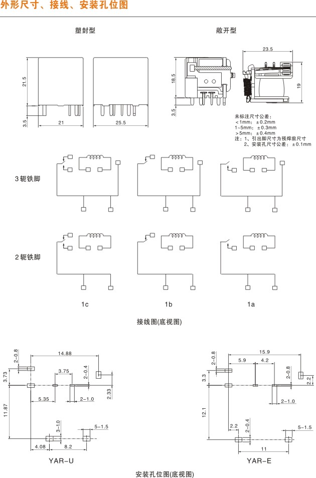 觸點形式繼電器常開或常閉(常見4、6只腳)、轉換(常見5只腳或8只腳)