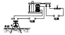 防訊報警器:k是接觸開關(guān),b是一個漏斗形的竹片圓筒,里面有個浮子a,水位上漲超過警戒線時,浮子a上升,使控制電路接通,電磁鐵吸下銜鐵,于是報警器指示燈電路接通,燈亮報警。