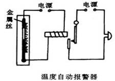 溫度自動報警器:當(dāng)溫度升高到一定值時,水銀溫度計中水銀面上升到金屬絲處,水銀是導(dǎo)體。因此將電磁鐵電路接通,電磁鐵吸引彈簧片,使電鈴電路閉合,電鈴響報警,當(dāng)溫度下降后,水銀面離開金屬絲,電磁鐵電路斷開,彈簧片回原狀,電鈴電路斷開,電鈴不再發(fā)聲。