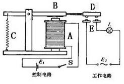 工作原理:電磁鐵通電時,把銜鐵吸下來使D和E接觸,工作電路閉合。電磁鐵斷電時失去磁性,彈簧把銜鐵拉起來,切斷工作電路。