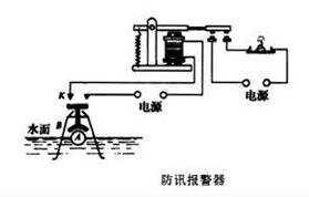 防訊報(bào)警器:K是接觸開關(guān),B是一個漏斗形的竹片圓筒,里面有個浮子A,水位上漲超過警戒線時,浮子A上升,使控制電路接通,電磁鐵吸下銜鐵,于是報(bào)警器指示燈電路接通,燈亮報(bào)警。