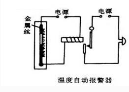 溫度自動報(bào)警器:當(dāng)溫度升高到一定值時,水銀溫度計(jì)中水銀面上升到金屬絲處,水銀是導(dǎo)體。因此將電磁鐵電路接通,電磁鐵吸引彈簧片,使電鈴電路閉合,電鈴響報(bào)警,當(dāng)溫度下降后,水銀面離開金屬絲,電磁鐵電路斷開,彈簧片回原狀,電鈴電路斷開,電鈴不再發(fā)聲。